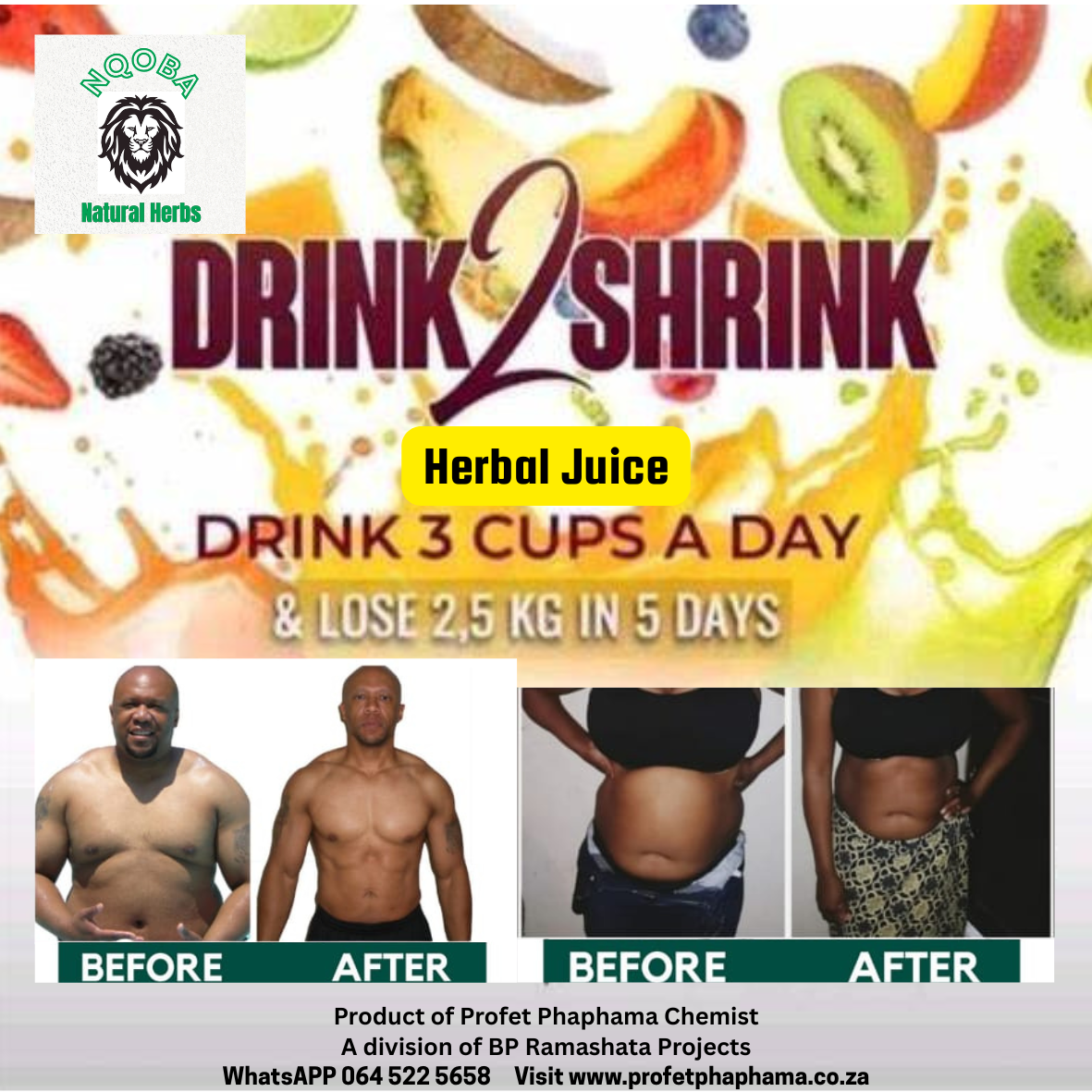We proudly, professionally produce and own NQOBA Natural Herbs, known to help with various physical and spiritual body ailments. NQOBA Natural Herbs are endorsed by Profet Phaphama, a gifted South African healer and herbalist. We also produce the great tasting, sugar free Drink 2 Shrink herbal juice, known to boost wellness, whilst reducing an enlarged stomach.