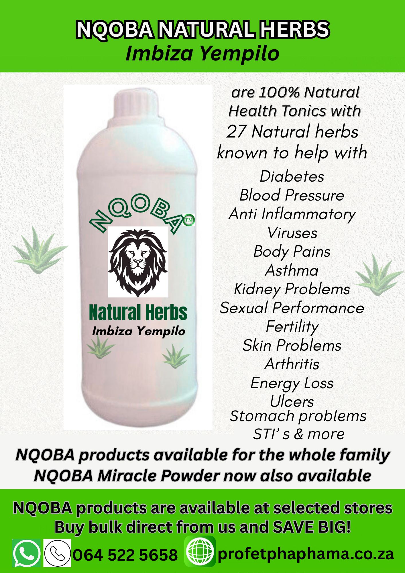 NQOBA Natural Herbs “Imbiza Yempilo” for the whole family, which boosts general wellness and helps prevent potential illnesses